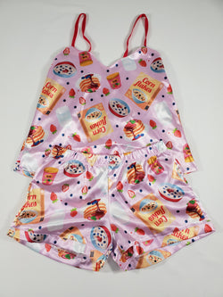 Satin Women's pajama set breakfast cereal theme shorts and blouse